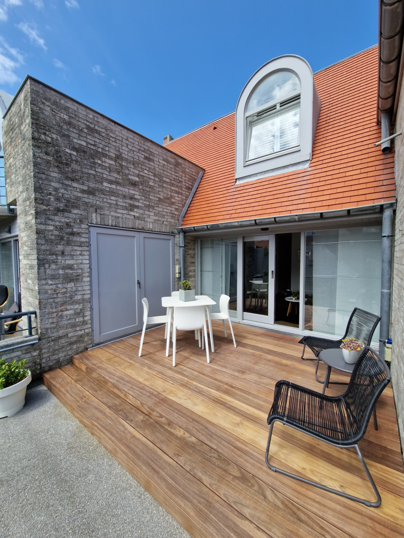 Het appartement heeft een ruim zuidgericht terras, een mooie leef- en eetruimte en een goed ingerichte keuken. Boven zijn er een badkamer en 3 ruime slaapkamers, waarvan 1 met een bureau. Beneden is er nog een douche en een extra gastentoilet. Dit maakt het appartement bij uitstek gepast voor grotere gezinnen, twee gezinnen die samen met vakantie gaan of grootouders die genieten van een vakantie met de kleinkinderen en hun eigen kinderen in het weekend op bezoek hebben.